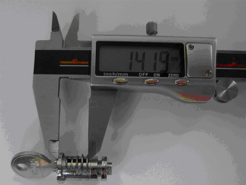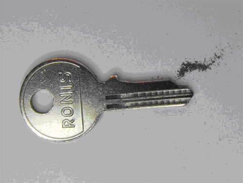 10. Put the new key in the tumbler. It is then necessary to file the blank key until the tabs on top and bottom disappear into the tumbler.